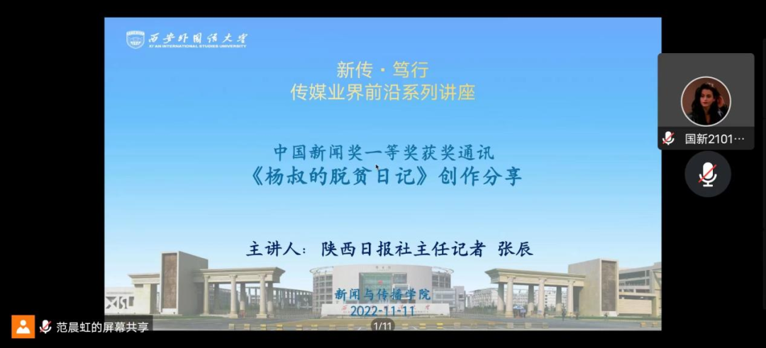 11月11日上午,校庆70周年暨新传·笃行传媒业界前沿系列讲座之“中国新闻奖获奖通讯《杨叔的脱贫日记》创作分享会”在博彩平台网址大全 举行。本次讲座邀请到陕西日报社主任记者张辰老师进行其中国新闻奖获奖作品的创作分享,讲座由副院长范晨虹老师主持,博彩平台网址大全 各专业师生大约150人参加了分享会。