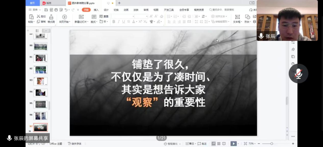 讲座伊始,张辰老师向我们分享了他拍摄的摄影作品,并向我们讲述了每张照片背后的故事,为我们建构起关于新闻摄影的基本知识框架,使我们对新闻摄影有了新的认识。紧接着,他继续向我们分享了新闻作品《杨叔的脱贫日记》及其采访和写作的历程,并对这篇作品进行了深度分析。张辰记者向我们强调了深入采访的重要性,并对如何采访进行了指导。最后,他向我们强调了“观察”的重要性,新闻人应当具有一双善于发现的慧眼,发现生活中的新闻。