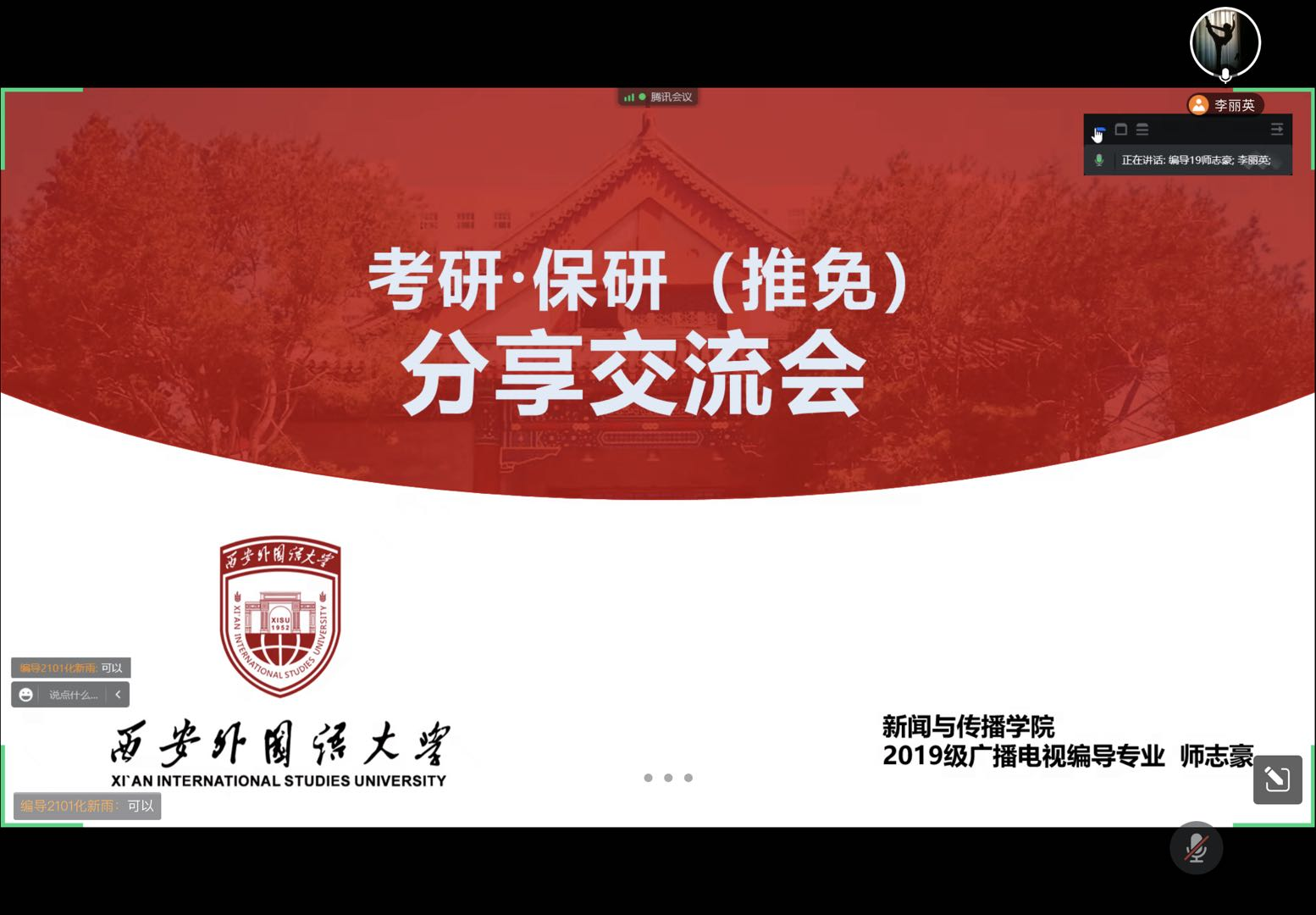 针对2020级学生普遍有考研诉求的情况,教研室邀请学院本年度三位保研学生开展了“坚定目标,奔向研路”的主题分享沙龙活动。本次活动采用线上形式,李丽英、赵桐羽两位老师参加了本次活动。三位同学依次对保研流程、准备工作、参赛经历、科研学术等内容进行了介绍,并对自己的一些面试心得进行分享。分享沙龙结束后,同学们表示收获颇丰,表示要将学长学姐的经验吸收到自己的备考学习中,争取能够一举上岸。