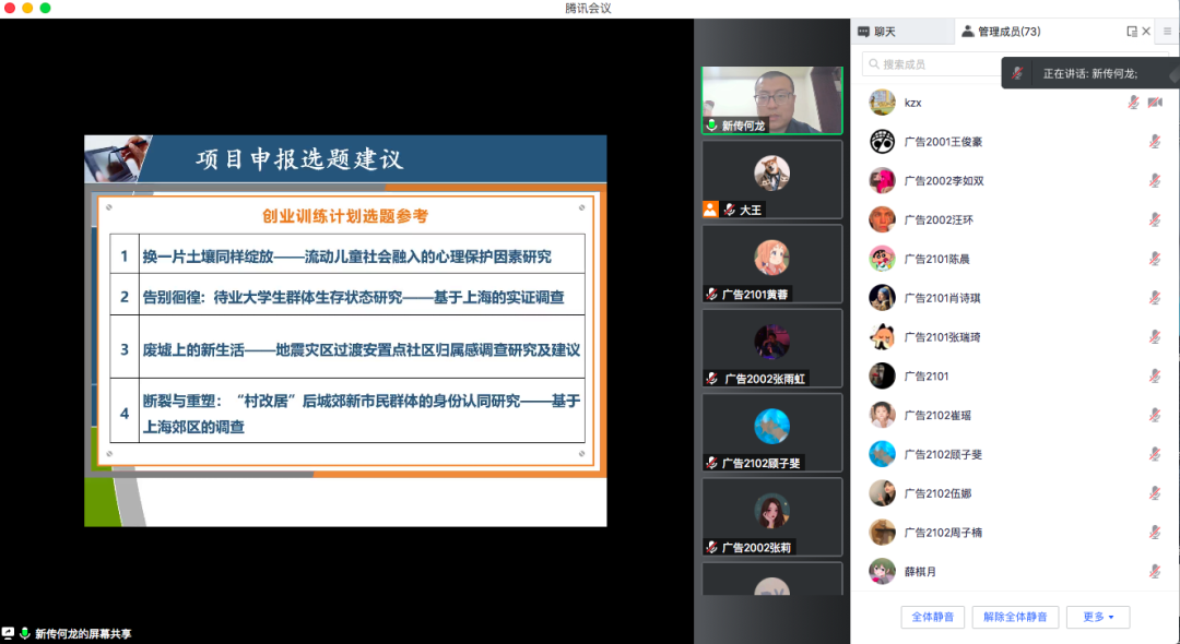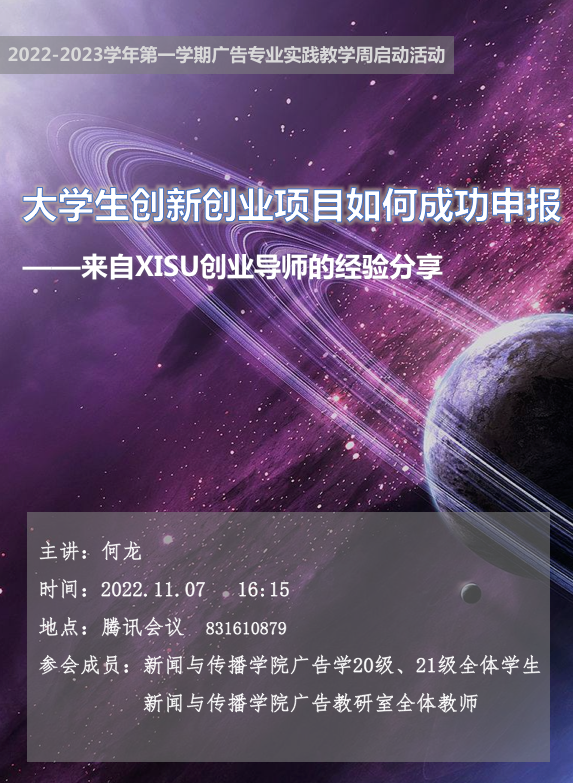 活动伊始,学校创业导师何龙老师为20级、21级广告专业的全体师生作了大学生创新创业项目如何申报的主题经验分享。何老师指导大创项目经验丰富,针对申报大创项目的选题来源、选题建议、写申报书的标准,以及申报过程中容易出现的问题等给同学们进行了详细讲解,并对学校近年来的申报情况进行了介绍,起到了切实的指导作用。