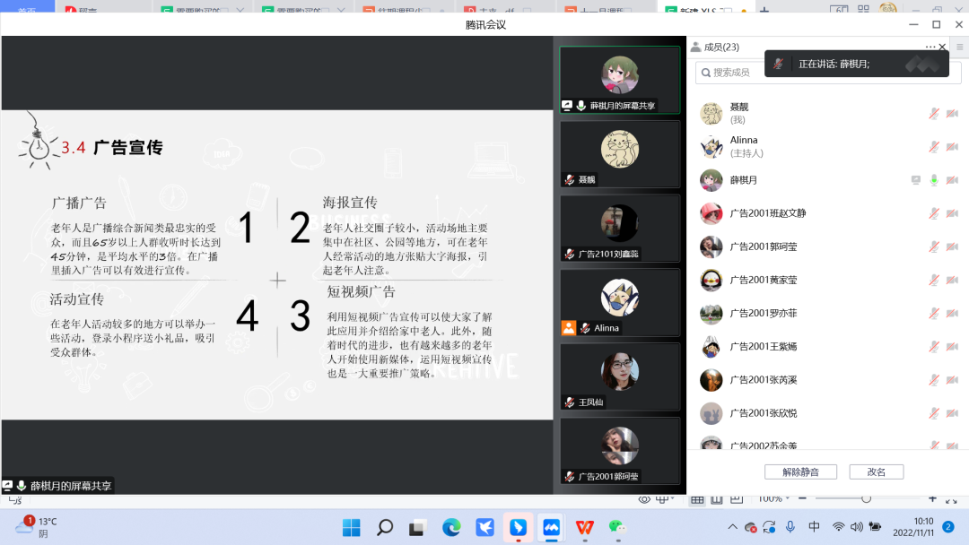 在实践活动中,学生以小组为单位对项目进行了深入讨论和调研,并开展了成果分享交流活动。同学们紧扣时代发展的脉搏,聚焦文化传播、生活娱乐,以及与社会民生息息相关的多个话题和痛点进行了深入洞察,体现了大学生关注社会、关注发展的广阔眼光和未来中国媒体人、广告人的职业理想信念。