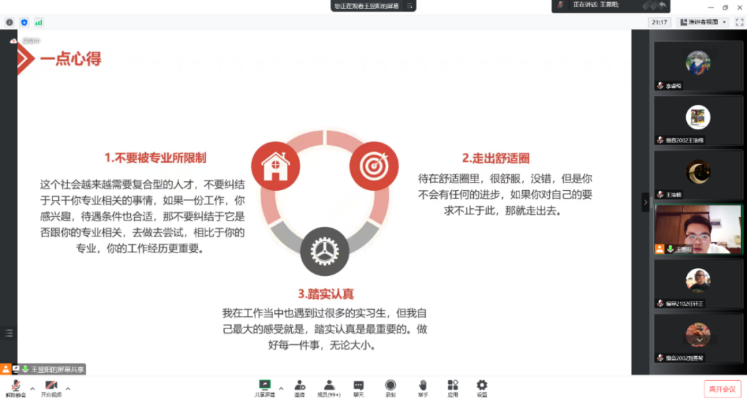 会议伊始,王昱阳分享了自身丰富的实习和工作经历,他结合自己的就业经历,鼓励同学们要时刻做好准备,多尝试不同的领域,注重自我能力的提升。随后,他向同学们分享了在校期间的学习经验,指导同学们要在实践的过程中具备时效性、创�
