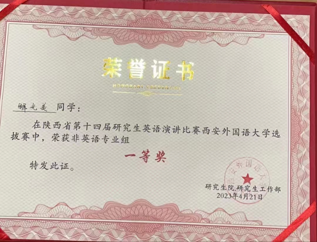 研究生解光美获陕西省第十四届研究生英语演讲比赛西外选拔赛非英语专业组第一